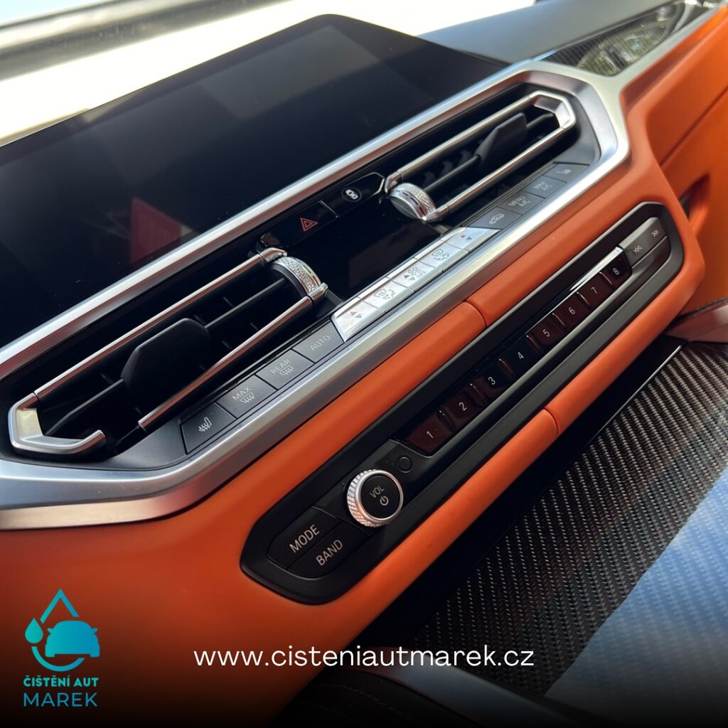 V interiéru jsme nejprve vozidlo důkladně vysáli, vyčistili stropnici a zaměřili se na veškeré části palubní desky, dveří a sedaček. Kůži na sedačkách jsme po vyčištění také odborně ošetřili.